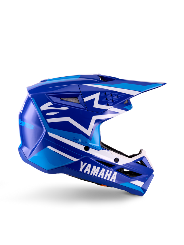 Alpinestars Yamaha S-M3 Youth Helmet ECE06, capacete de motocross para jovens, azul e branco, design angular com viseira longa, ventilação integrada, padrão geométrico com estrela, certificado ECE06, acabamento brilhante